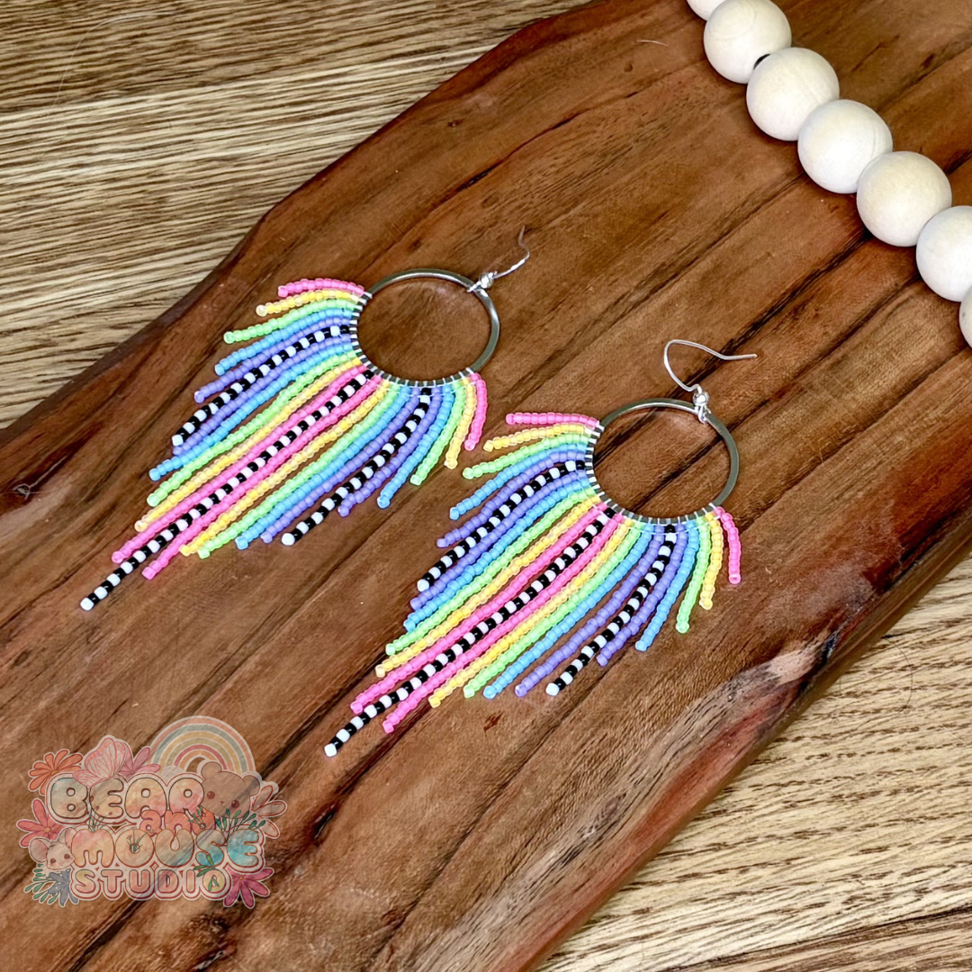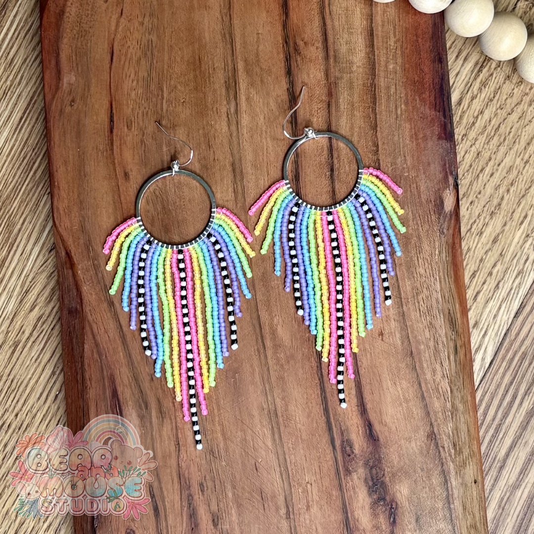 Brighten your day and your style with these stunning handmade fringe earrings! Beaded with bright and vibrant glass seed beads, and finished with stainless steel earring hooks. They are the perfect accessory to add a pop of purple and pink to any outfit!