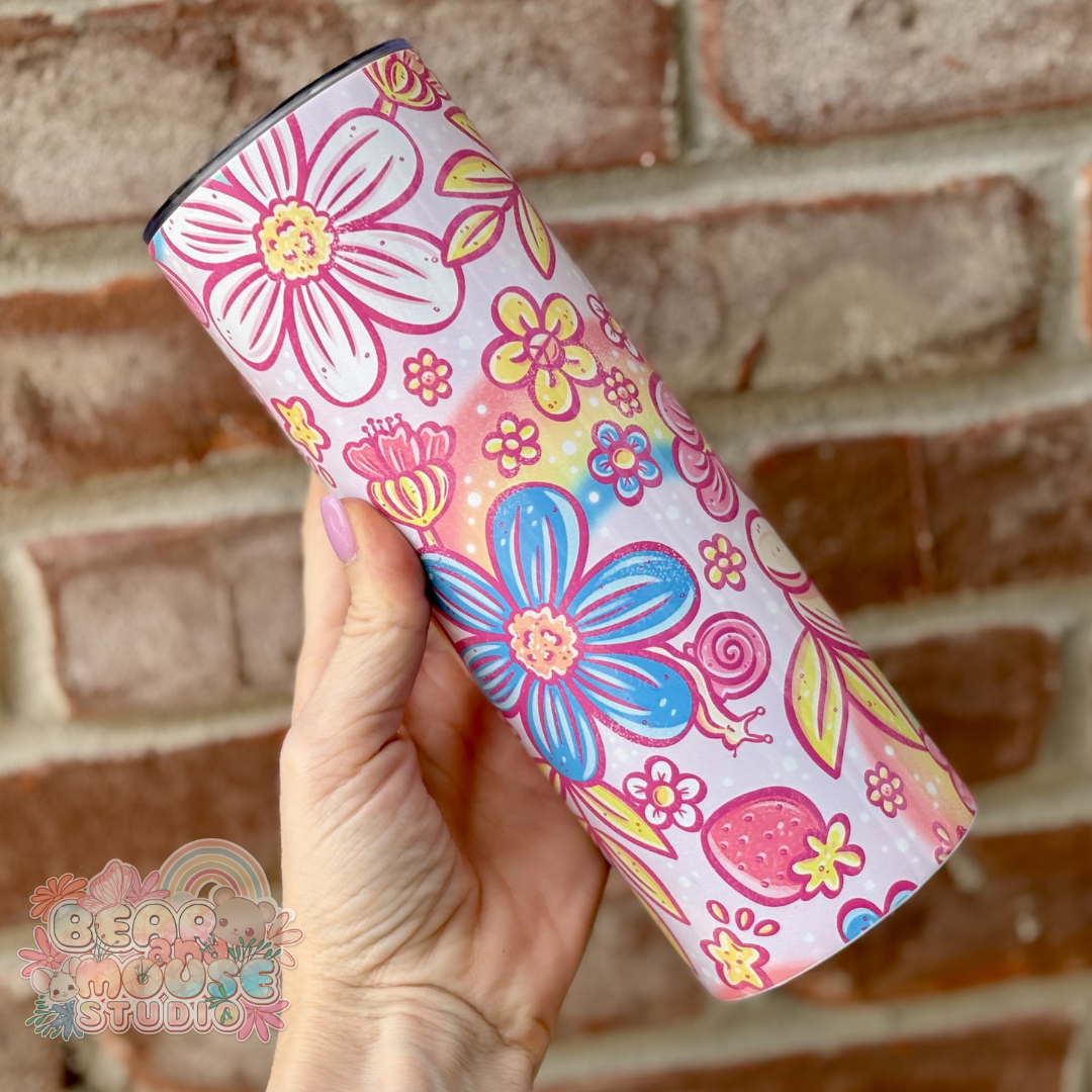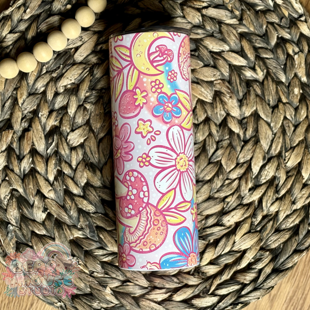 Take your happy vibes on the go with this colorful 20 ounce tumbler! Covered in bright, cheerful colors, it's made to make every sip feel a little more fun. Whether you're filling it with iced coffee, water, tea, or your favorite sweet drink, this tumbler adds a playful burst of personality to your day.