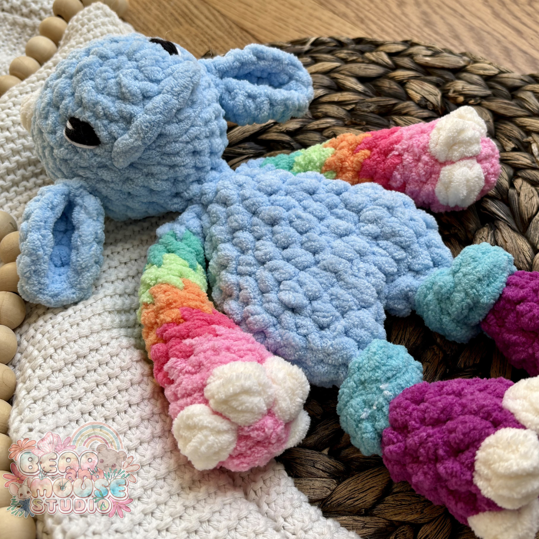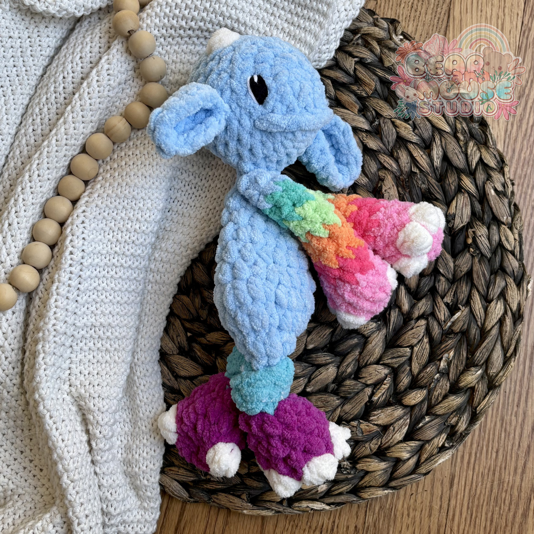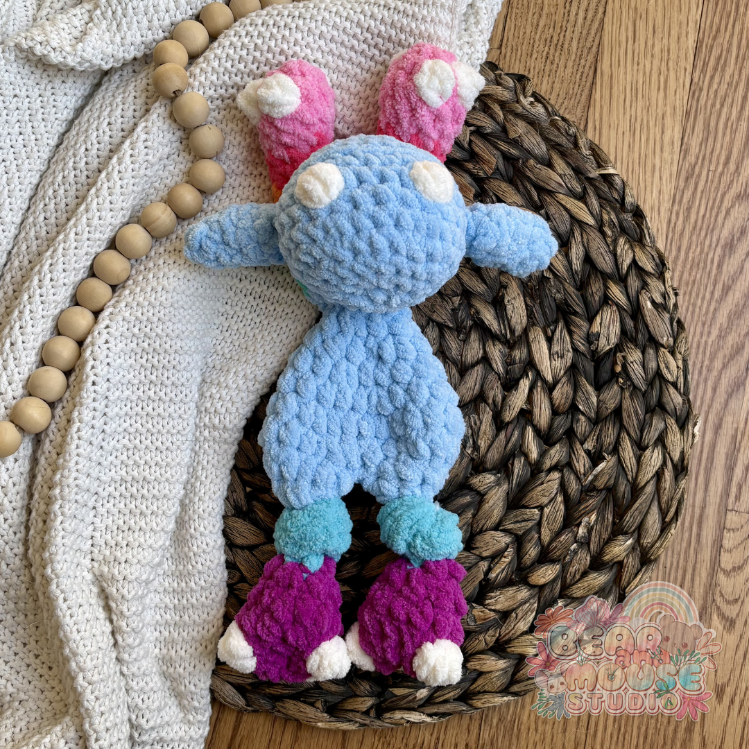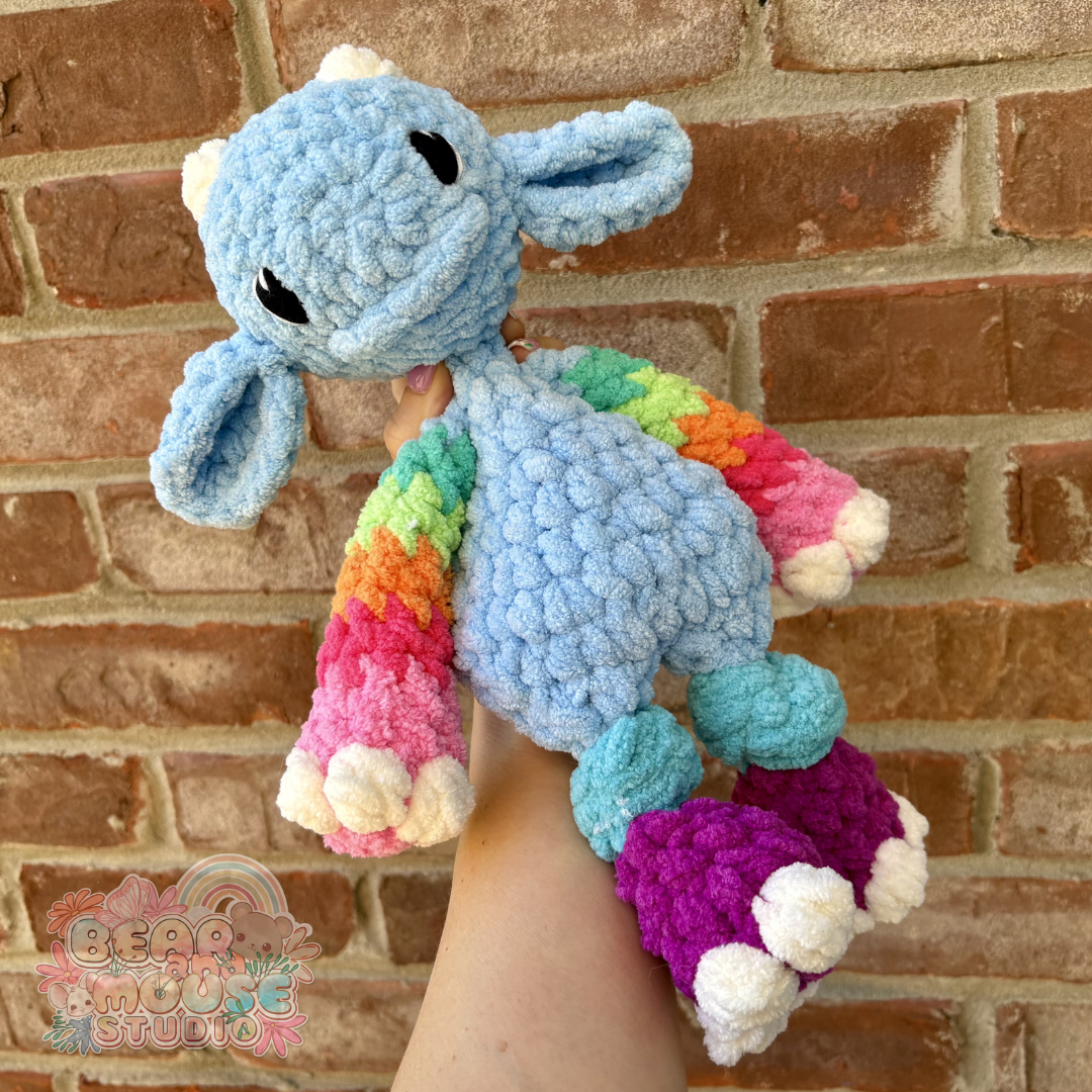 Meet your new cuddly companion! This handcrafted rainbow monster snuggler is a delightful combination of a cozy blanket and a loveable stuffed animal - designed for snuggling, cuddling, and imaginative play.