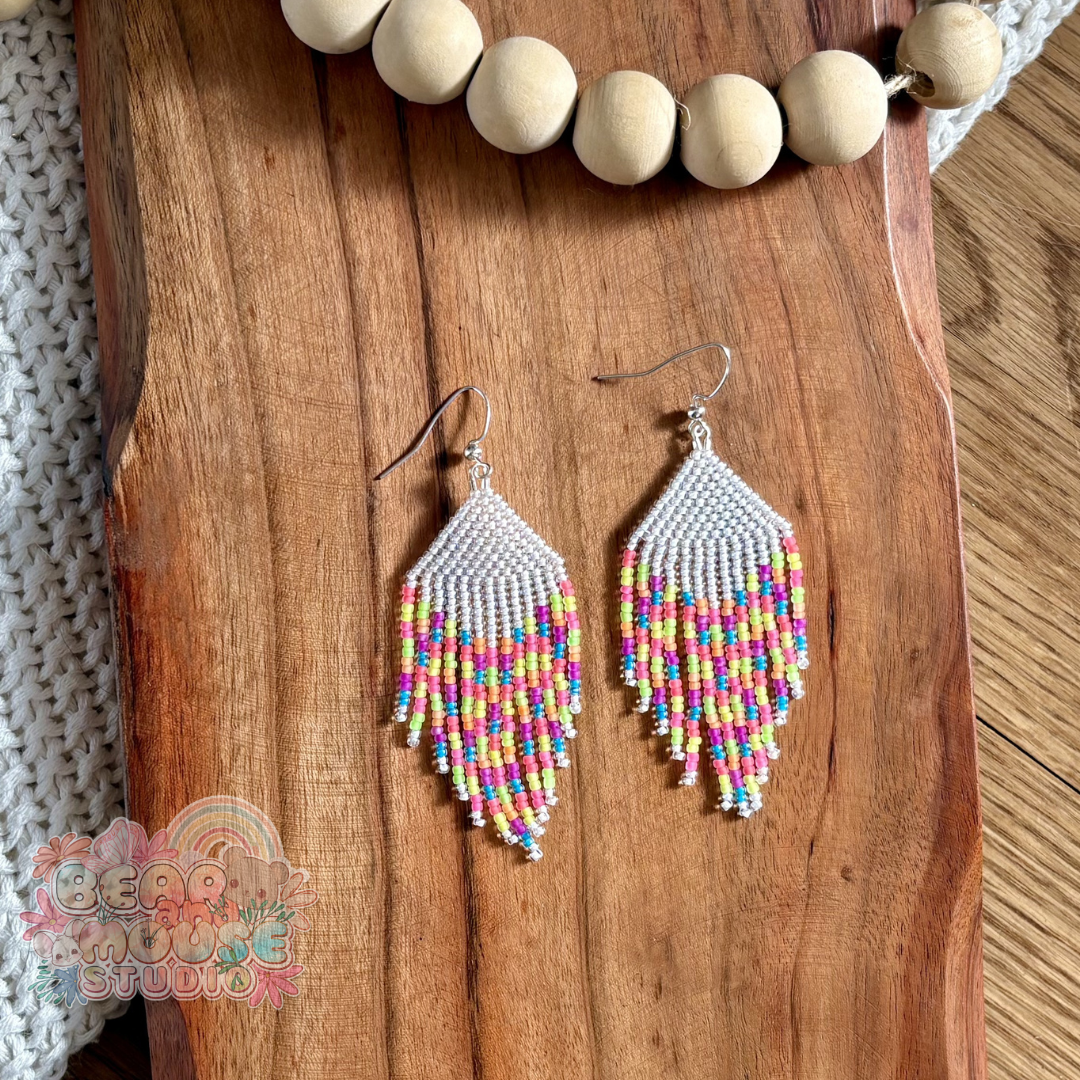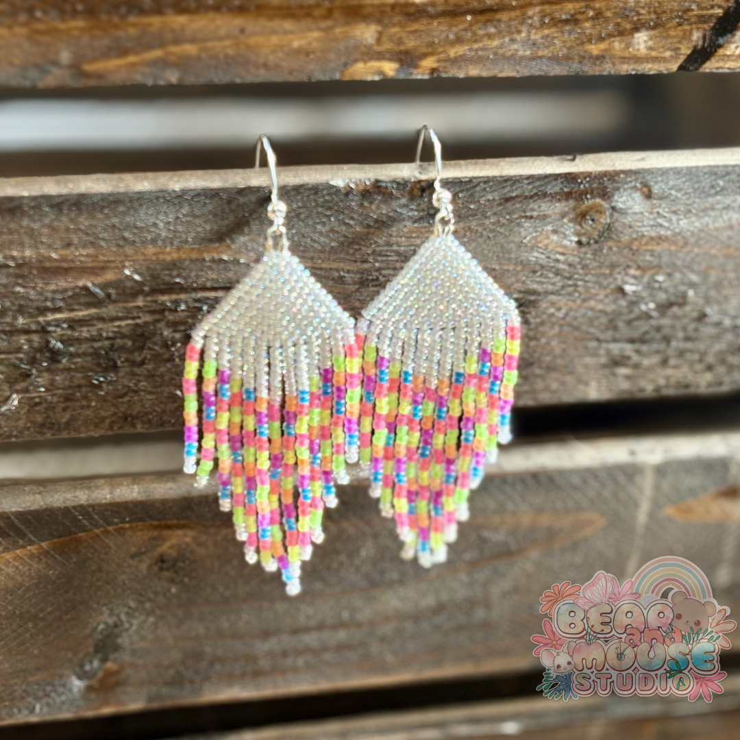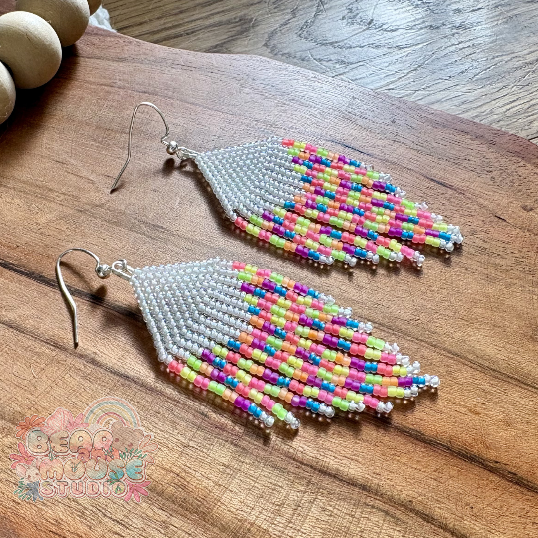 Brighten your day and your style with these stunning handmade fringe earrings! Beaded with bright and vibrant glass seed beads, and finished with stainless steel earring hooks. They are the perfect accessory to add a pop of purple and pink to any outfit!