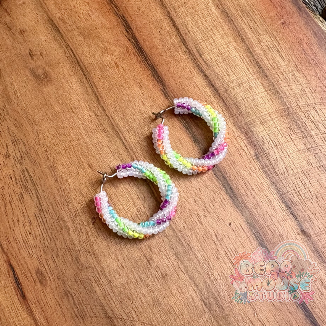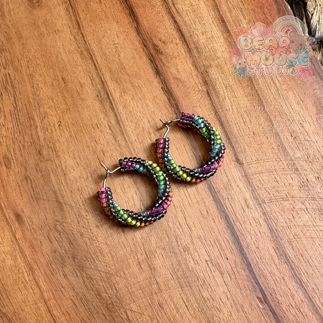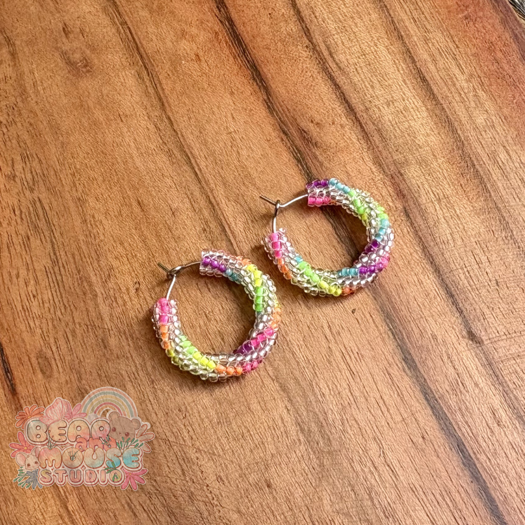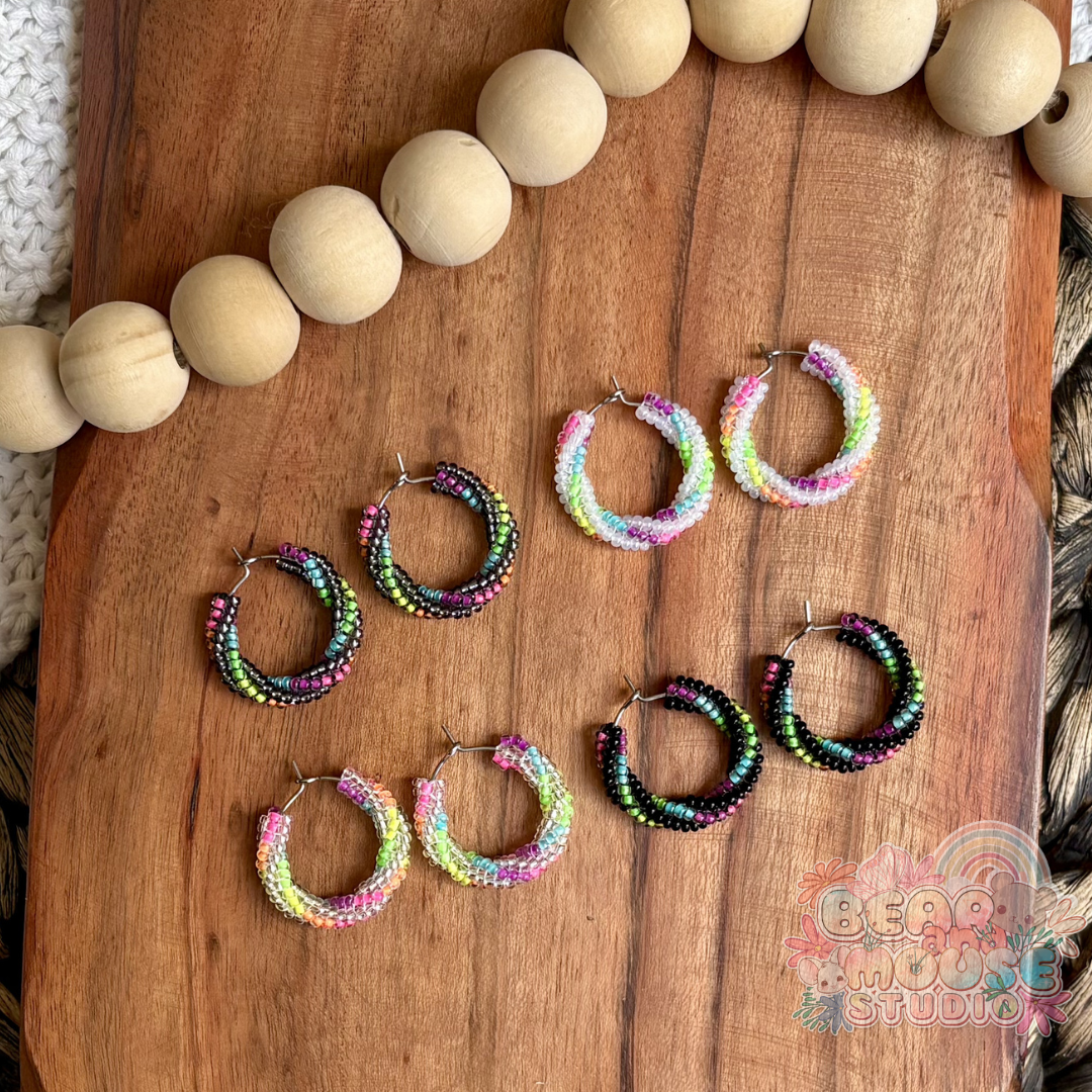 Brighten your day and your style with these stunning handmade hoops! Beaded with bright and vibrant glass seed beads, and finished with stainless steel earring hooks. They are the perfect accessory to add a pop of color to any outfit! (Psssst... You should check out these hoops under a blacklight!)