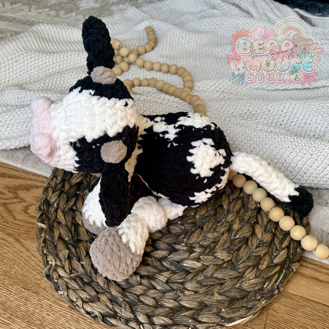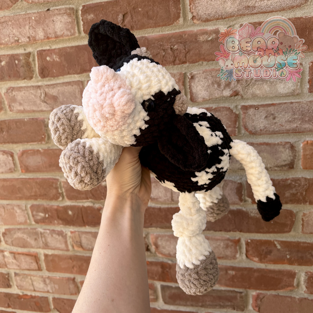 This cow is approximately 18 inches in length from nose to tip of tail. This plushie is made with super soft acrylic blanket yarn, plastic safety eyes, and polyester stuffing.